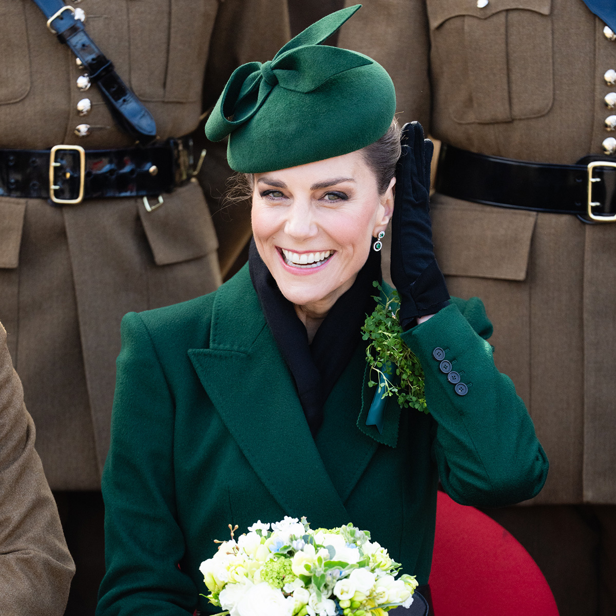 من أجل هذه المناسبة الملكية، نسقت كيت قطعة الرأس مع فستان أخضر زمردي من تصميم أندرو جن، بالإضافة إلى أقراط ثريا من مجموعة مجوهرات الراحلة الملكة إليزابيث الثانية وأوسمتها الملكية، بما في ذلك الحزام والنجمة.